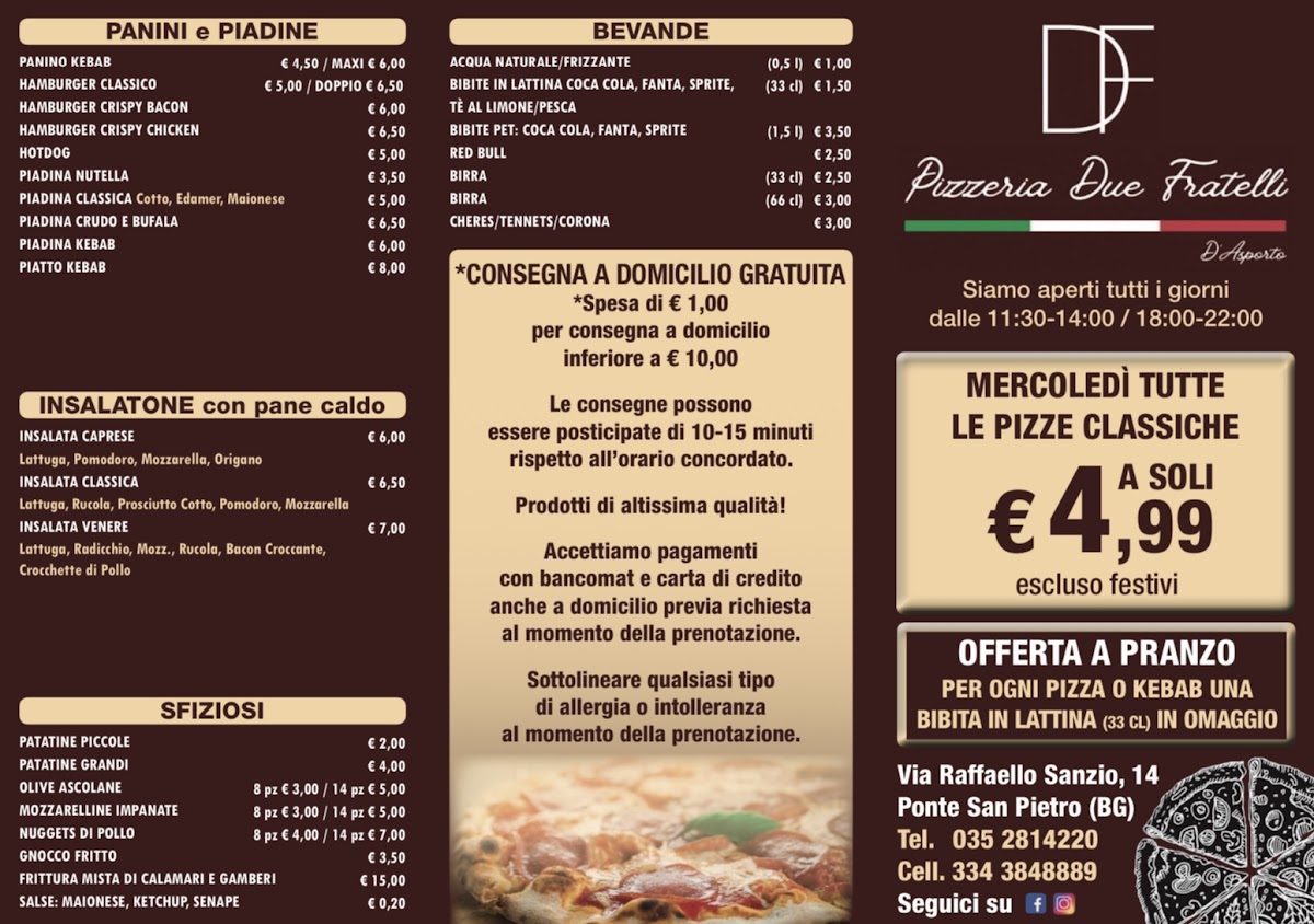 Pizzeria Due Fratelli in Ponte San Pietro is a true haven for pizza lovers seeking authentic Italian flavors. Located on Via Raffaello Sanzio, this pizzeria stands out for its traditional stone oven pizzas, delivering crispy crusts and rich, aromatic toppings that leave a lasting impression. The menu boasts a variety of classic and innovative pies, all crafted with care and high-quality ingredients, reflecting the culinary passion of its founders.
